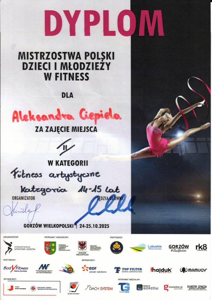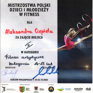 Warto dodać, że Ola ma także na swoim koncie udział w międzynarodowych zawodach European Championships Children Fitness w kategorii Artistic Fitness Girls 14-15 Years organizowanych przez IFBB Federation, gdzie zajęła siódme miejsce w swojej kategorii wiekowej.
