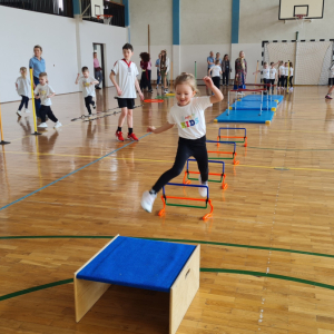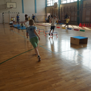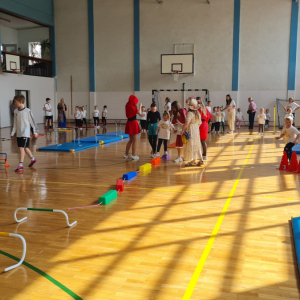 Kolejnym punktem programu była wspólna rozgrzewka w formie aerobiku, po której uczestnicy udali się na przygotowane tory przeszkód. Dzieci brały udział w różnorodnych konkurencjach sportowych dostosowanych do ich wieku i możliwości.