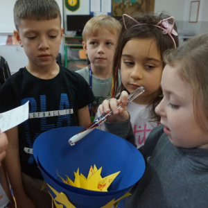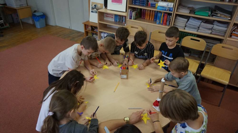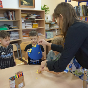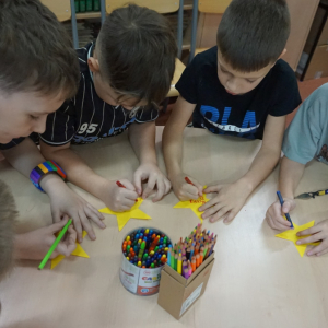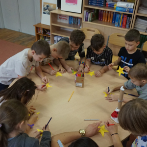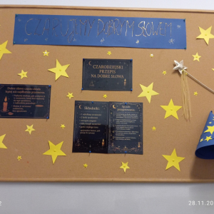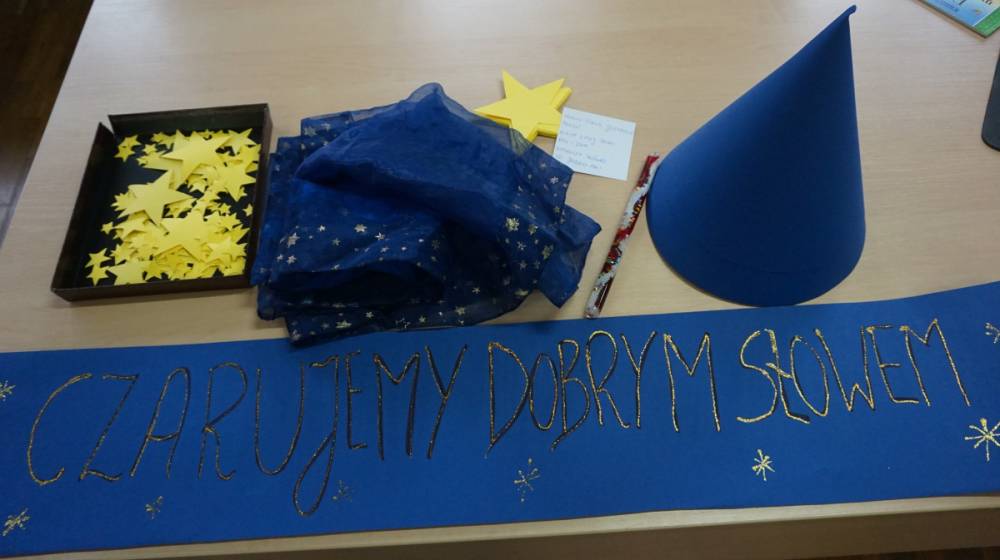 Rozmawialiśmy o tym, czym jest życzliwość, dlaczego jest tak ważna i jak wyglądałby świat bez niej. Wysłuchaliśmy piosenki o magicznych słowach, ozdobiliśmy czapkę czarnoksiężnika, a na papierowych gwiazdkach zapisaliśmy najpiękniejsze, życzliwe słowa. Potem… zaczęło się czarowanie! Każdy mógł wylosować gwiazdkę z dobrym słowem i podzielić się nim z innymi.