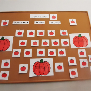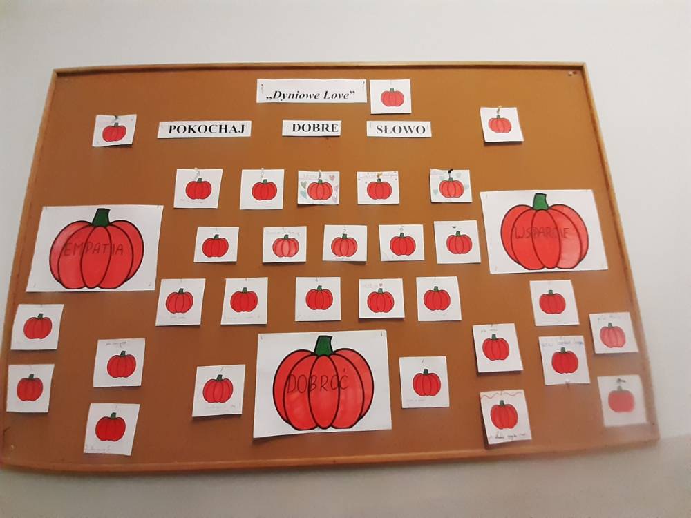 Na zakończenie zajęć wszystkie dynie połączyły się w piękną gazetkę ścienną, która teraz przypomina nam, jak ważne są dobre słowa i pozytywne emocje w naszej codzienności.