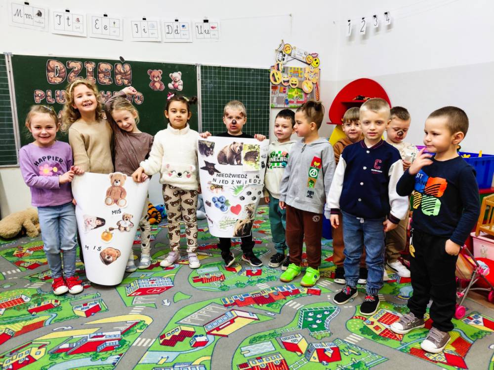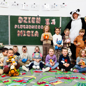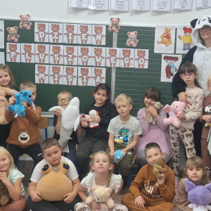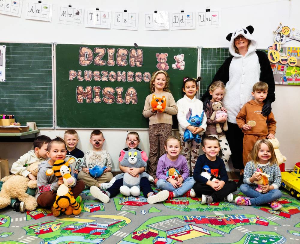 W zerówkach Opatowskiej Jedynki obchodziliśmy Dzień Pluszowego Misia, podczas którego dzieci przyniosły do szkoły swoje ulubione pluszaki. Zajęcia rozpoczęliśmy od rozmowy w kręgu – każde dziecko mogło przedstawić swojego misia, opowiedzieć o jego imieniu i dlaczego jest dla niego ważny. Następnie wspólnie poznaliśmy krótką historię powstania pluszowego misia oraz porozmawialiśmy o tym, dlaczego maskotki są dla dzieci tak wyjątkowe. Tego dnia najmłodszych uczniów naszej szkoły odwiedził Miś Panda, który częstował ich miodem, uczestniczył w zabawach, tańcach oraz chętnie pozował do zdjęć. Dzieci podczas zajęć artystycznych wykonały misie z balonów i talerzyków papierowych. Chętnie kodowały na dywanie, tańczyły ze swoimi misiami, wykonywany ćwiczenia gimnastyczne. Dzień upłynął w radosnej, przyjaznej atmosferze, a dzieci z entuzjazmem uczestniczyły w proponowanych aktywnościach.