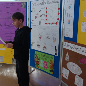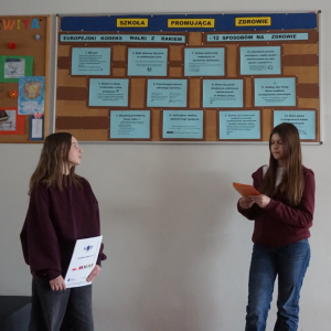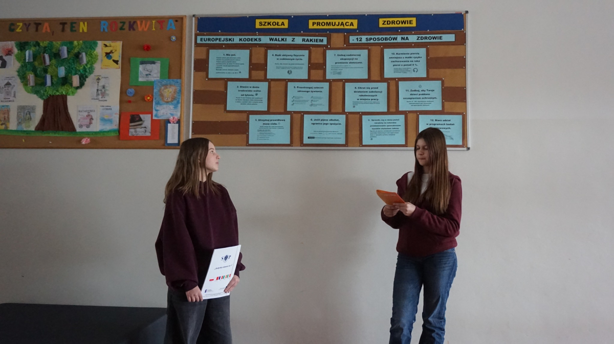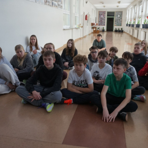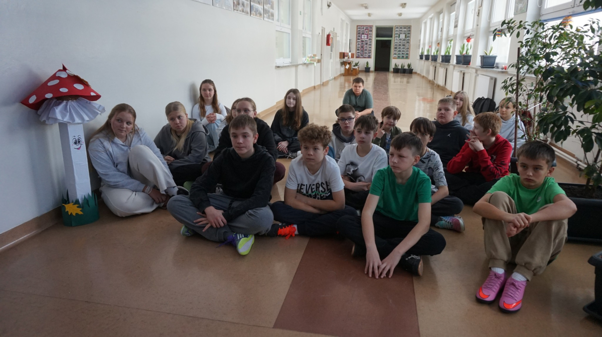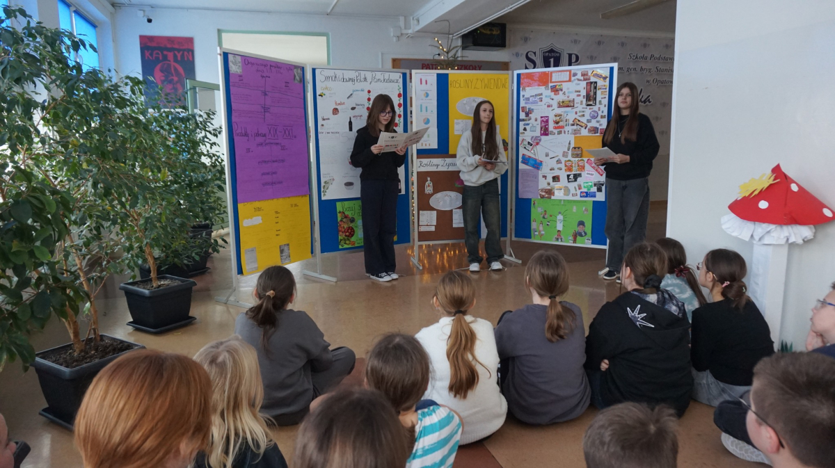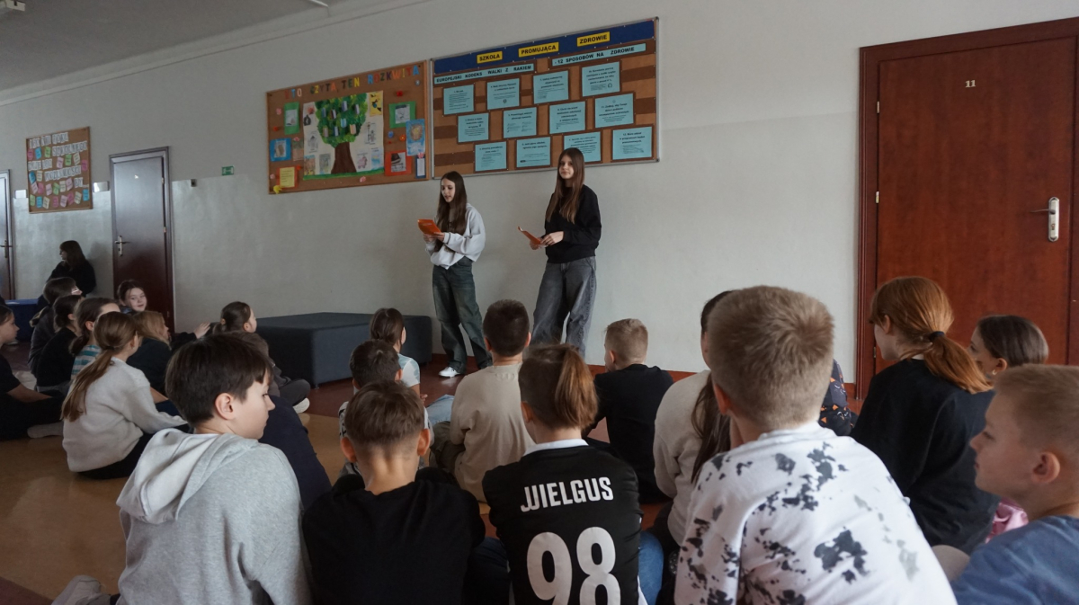 Uczniowie klasy 7b przedstawiają uczniom klas 4-tych oraz klasie 6a Opatowskiej Jedynki wnioski oraz materiały opracowane podczas realizacji projektu „Małe kroki do wielkiego zdrowia”, który został zrealizowany w ramach ogólnopolskiego programu Moc Relacji w Edukacji – łączymy, aby zmieniać.