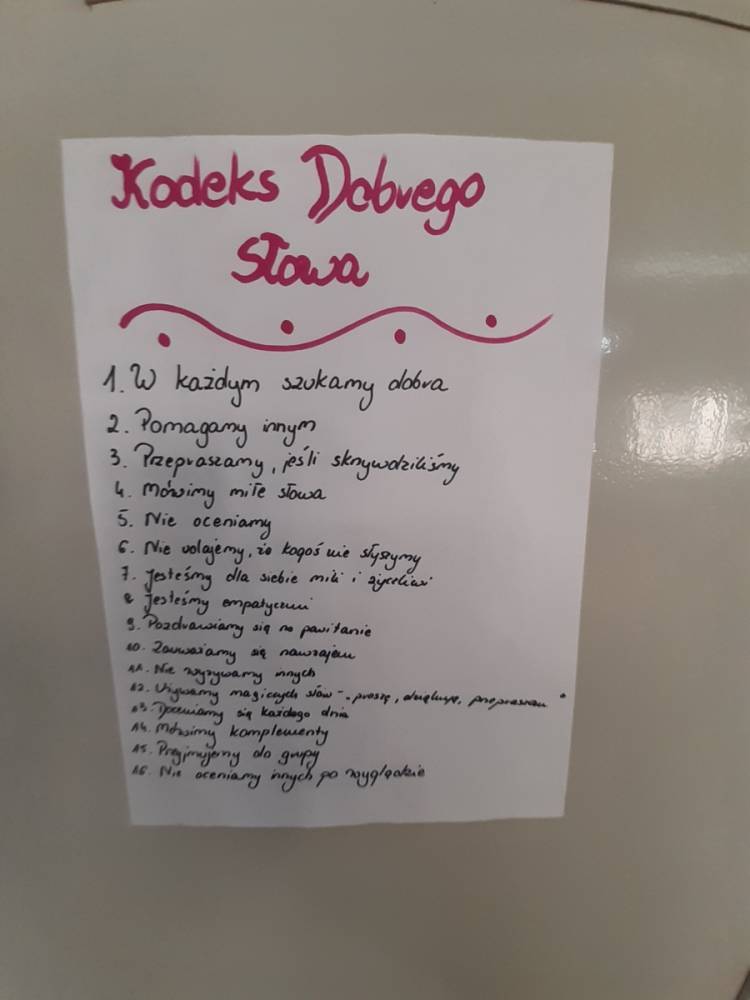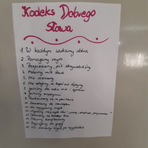 Efektem wspólnej pracy było stworzenie Kodeksu Dobrego Słowa – zbioru zasad, które będą towarzyszyć nam każdego dnia w szkolnym życiu.