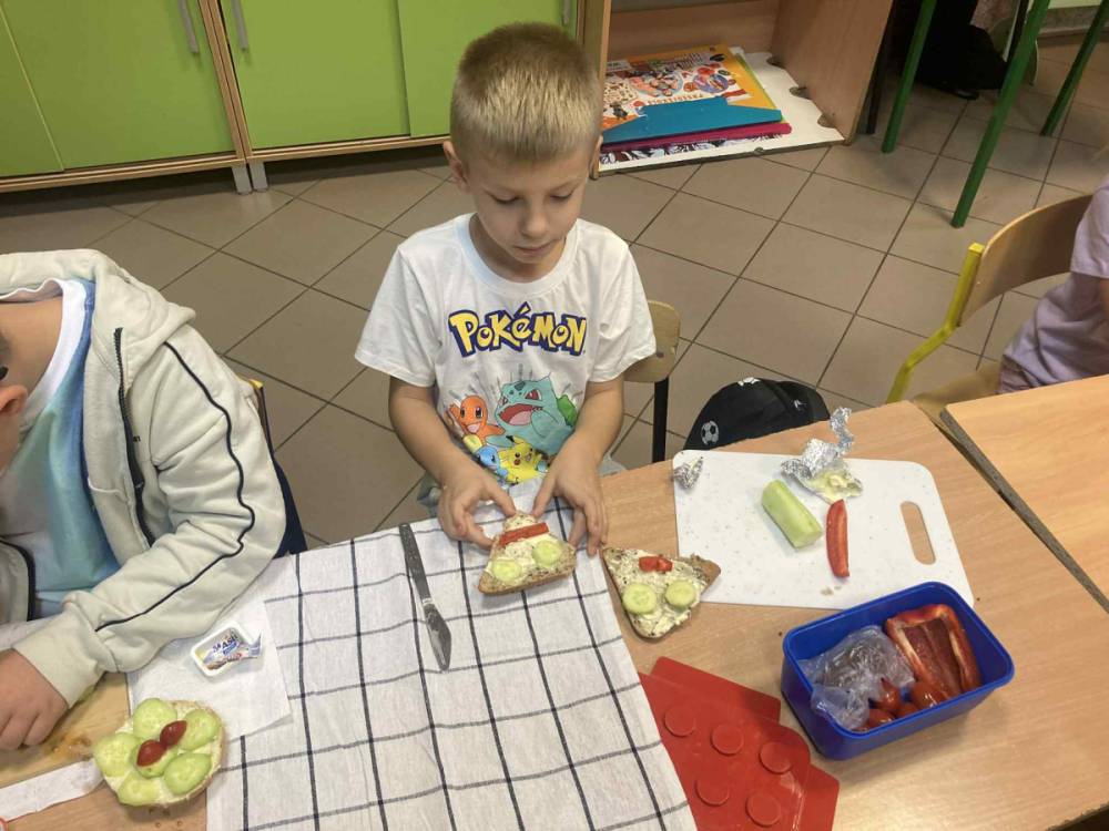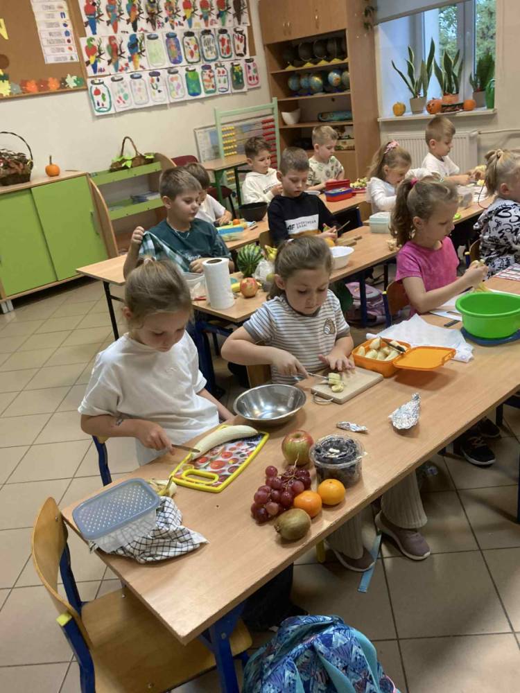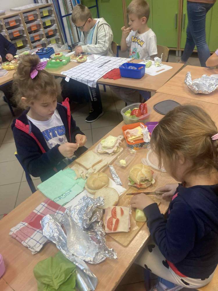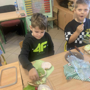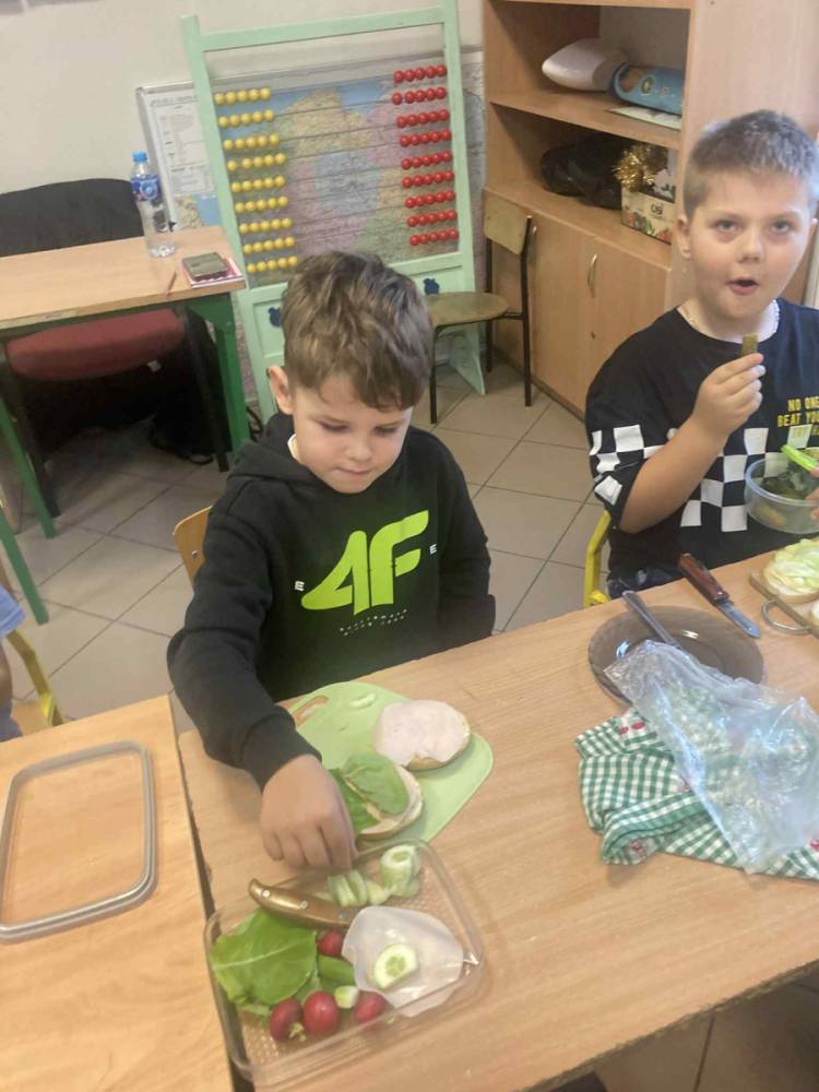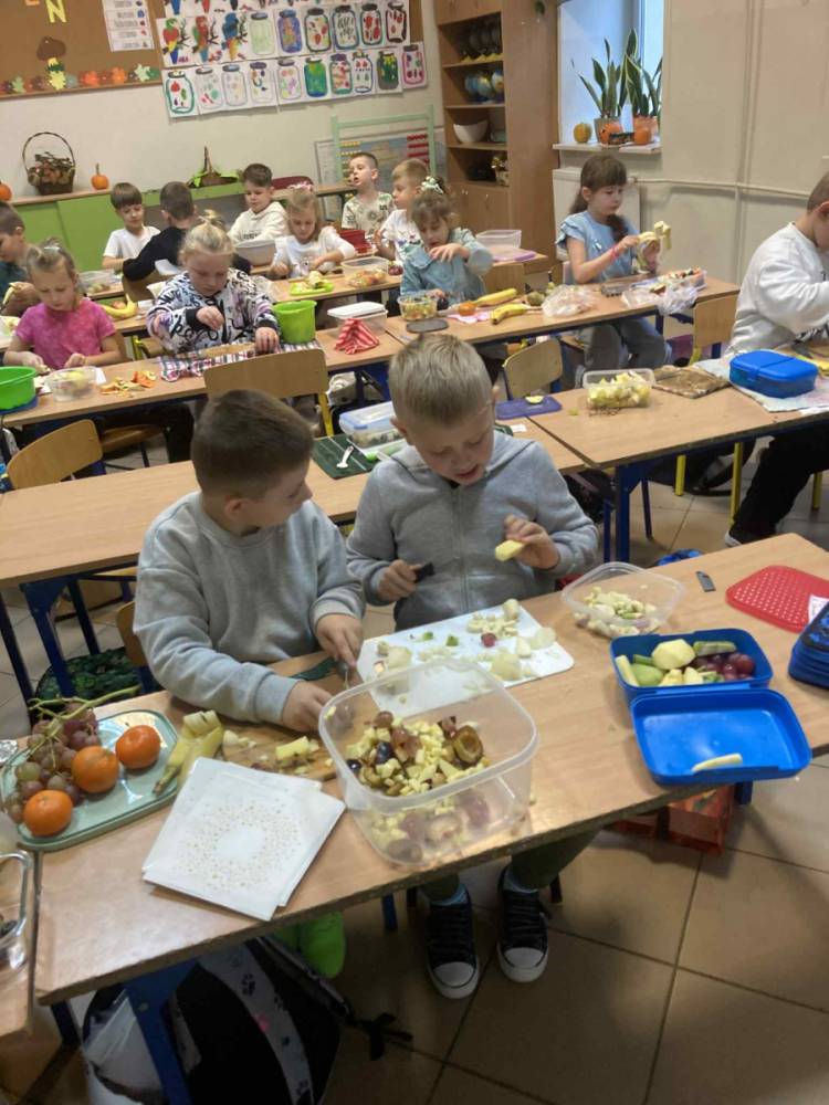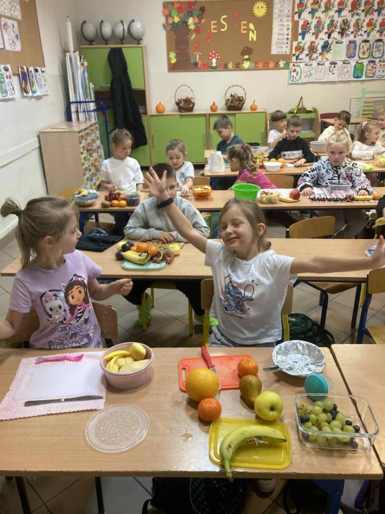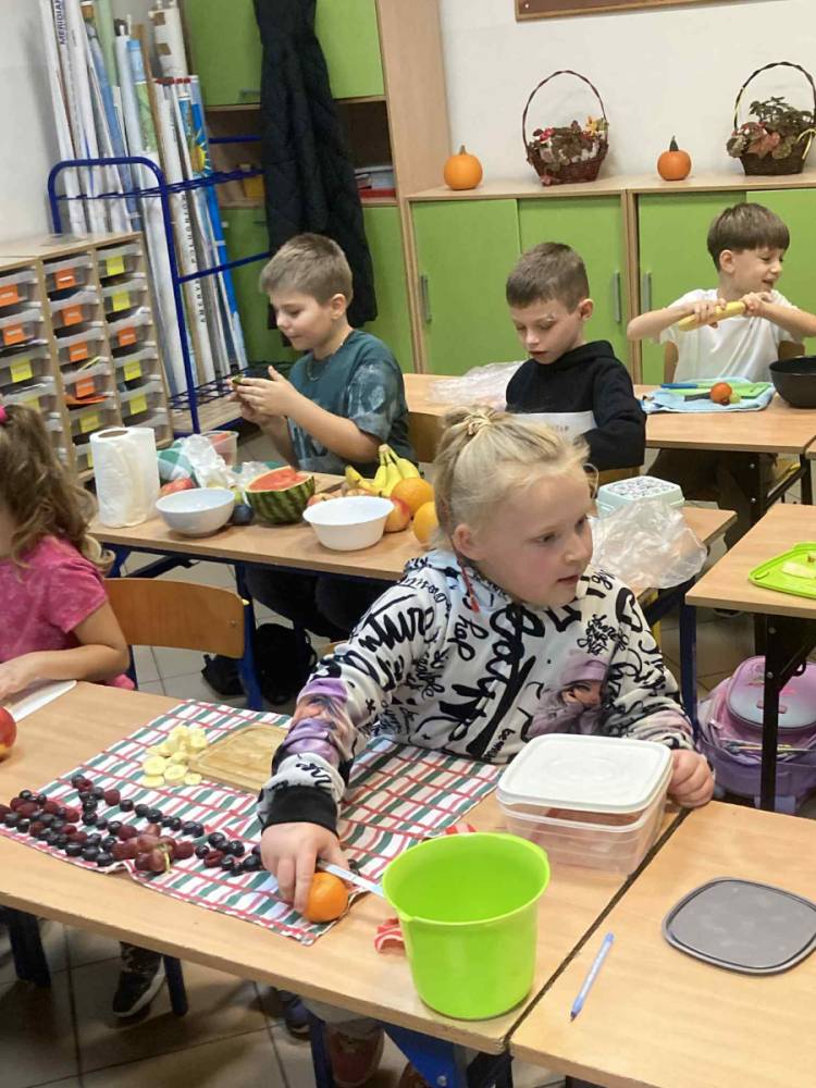W klasie 1B, w ramach programu Szkoła promująca zdrowie, rozpoczęliśmy realizację własnej inicjatywy pod nazwą Zdrowe piątki. Co tydzień w piątek rozmawiamy o zdrowym stylu życia i dobrych nawykach żywieniowych. Uczniowie przygotowali już pyszną i kolorową sałatkę owocową, a podczas ostatnich zajęć dzieci przygotowały drugie śniadanie- pełne warzyw, owoców i kolorowych kanapek. Wspólne przygotowanie posiłku sprawiło wszystkim wiele radości, a jeszcze więcej przyjemności dało nam wspólne jedzenie przy klasowym stole.