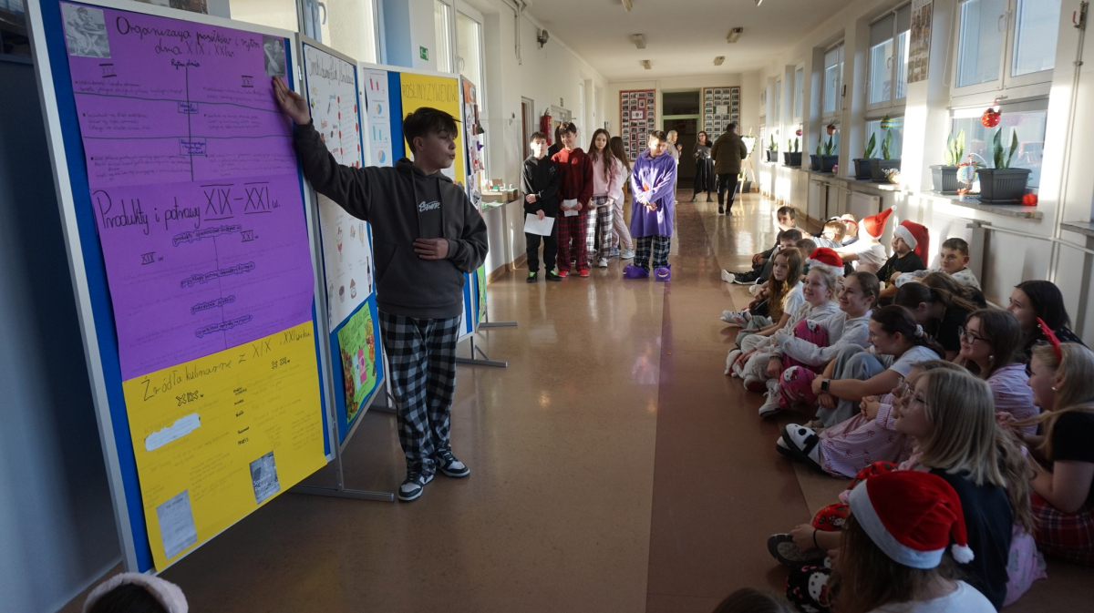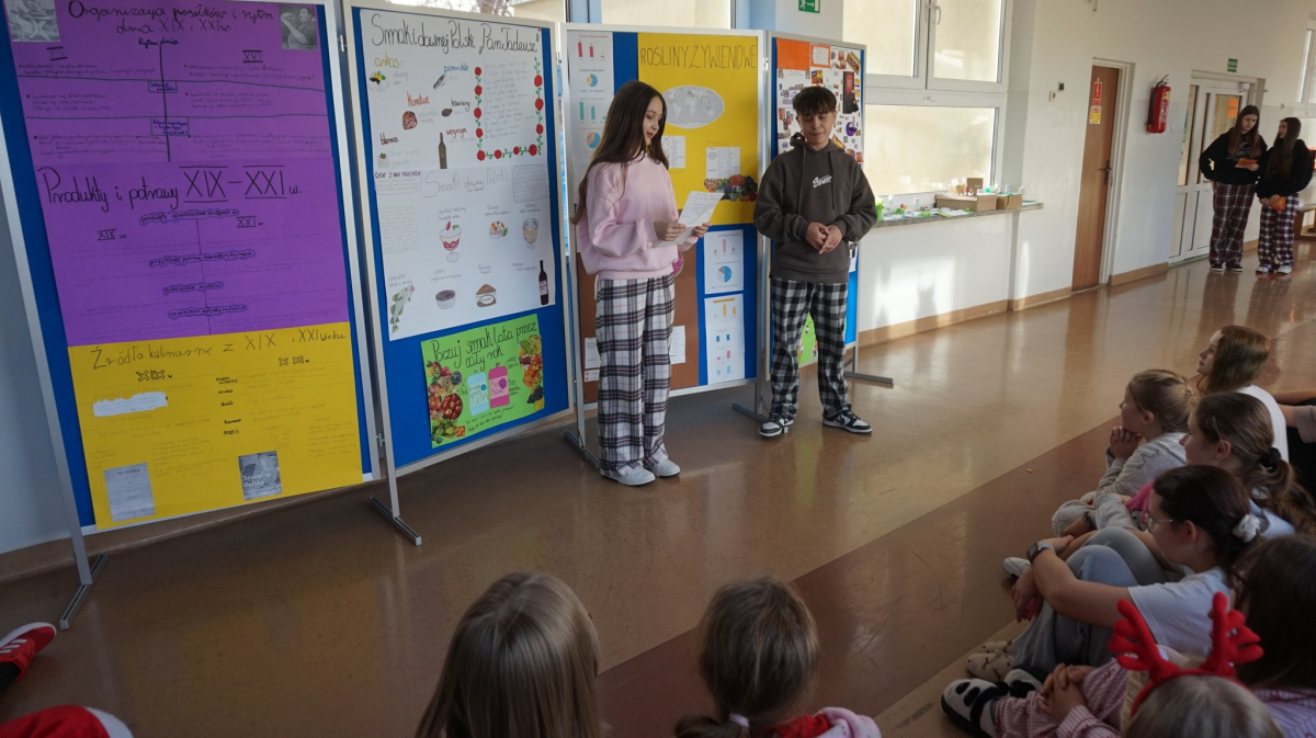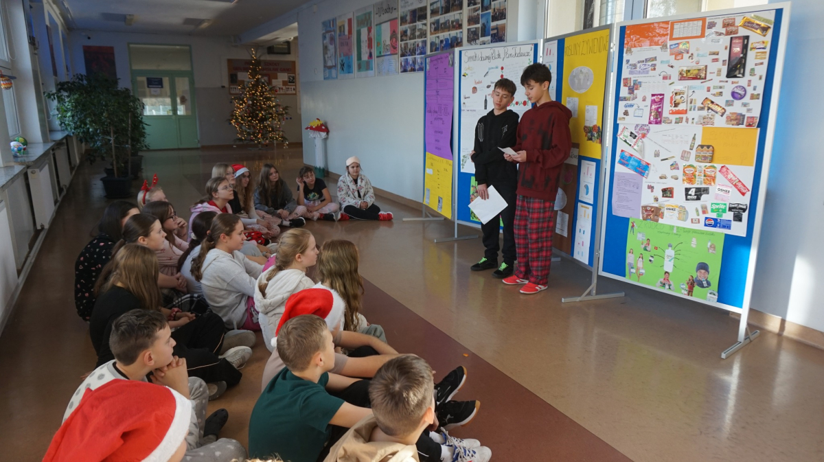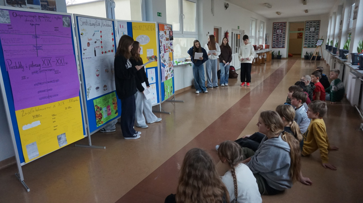 Uczniowie klasy 7b przedstawiają uczniom klas 4–8 Opatowskiej Jedynki wnioski oraz materiały opracowane podczas realizacji projektu „Małe kroki do wielkiego zdrowia”, który został zrealizowany w ramach ogólnopolskiego programu Moc Relacji w Edukacji – łączymy, aby zmieniać.