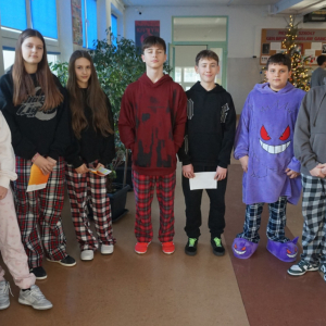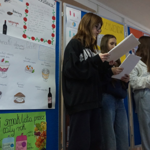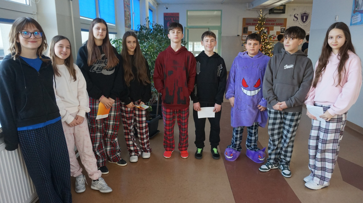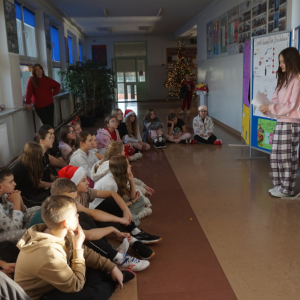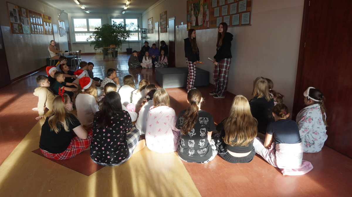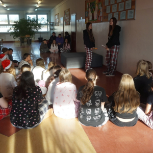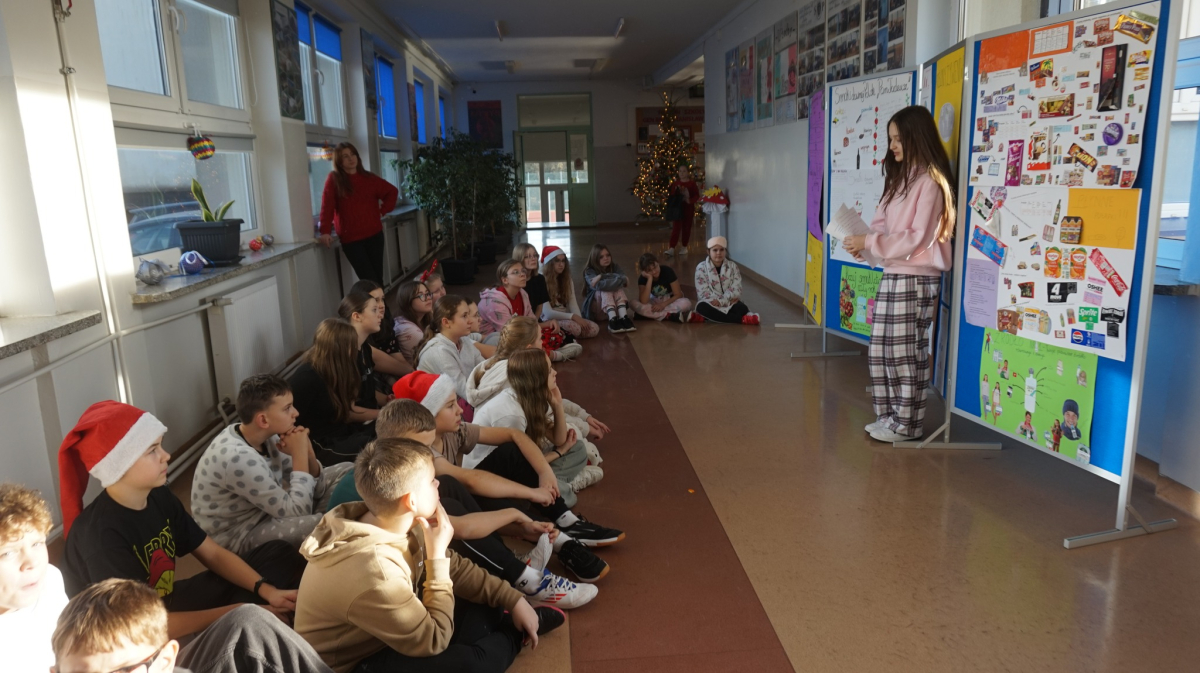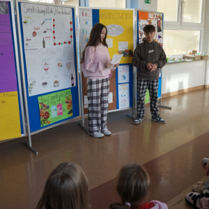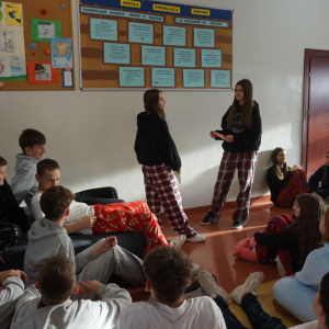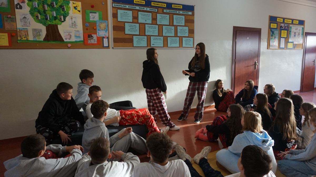 Uczniowie klasy 7b przedstawiają uczniom klas 4–8 Opatowskiej Jedynki wnioski oraz materiały opracowane podczas realizacji projektu „Małe kroki do wielkiego zdrowia”, który został zrealizowany w ramach ogólnopolskiego programu Moc Relacji w Edukacji – łączymy, aby zmieniać.
