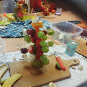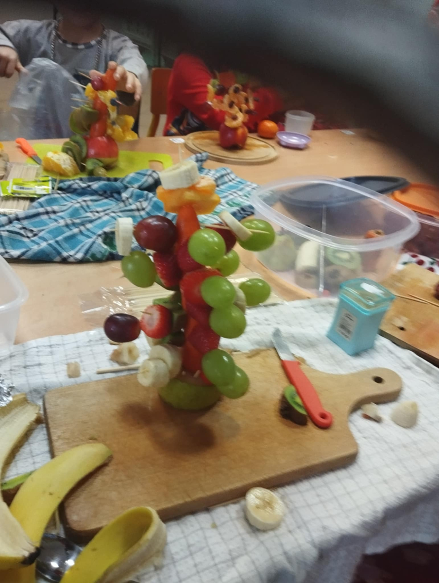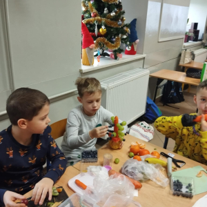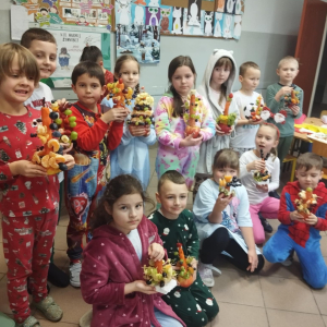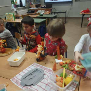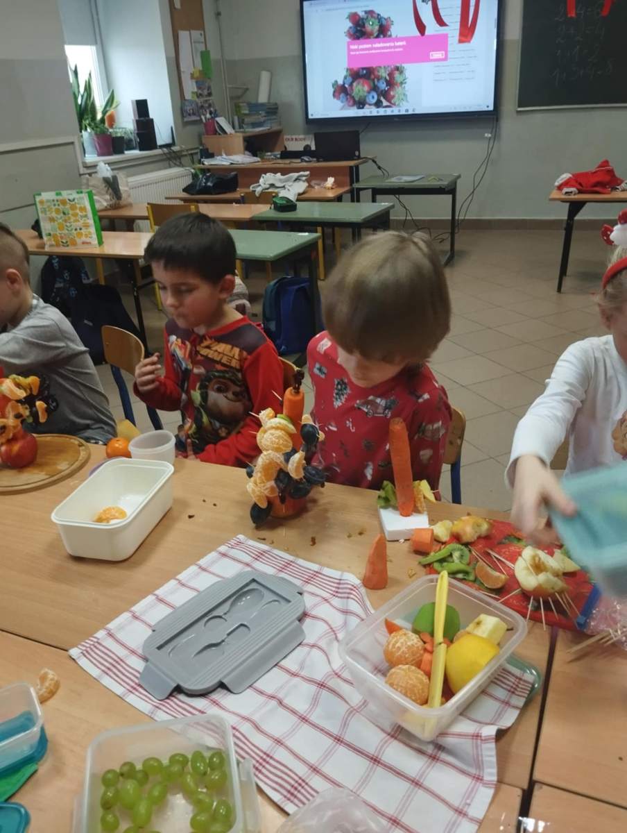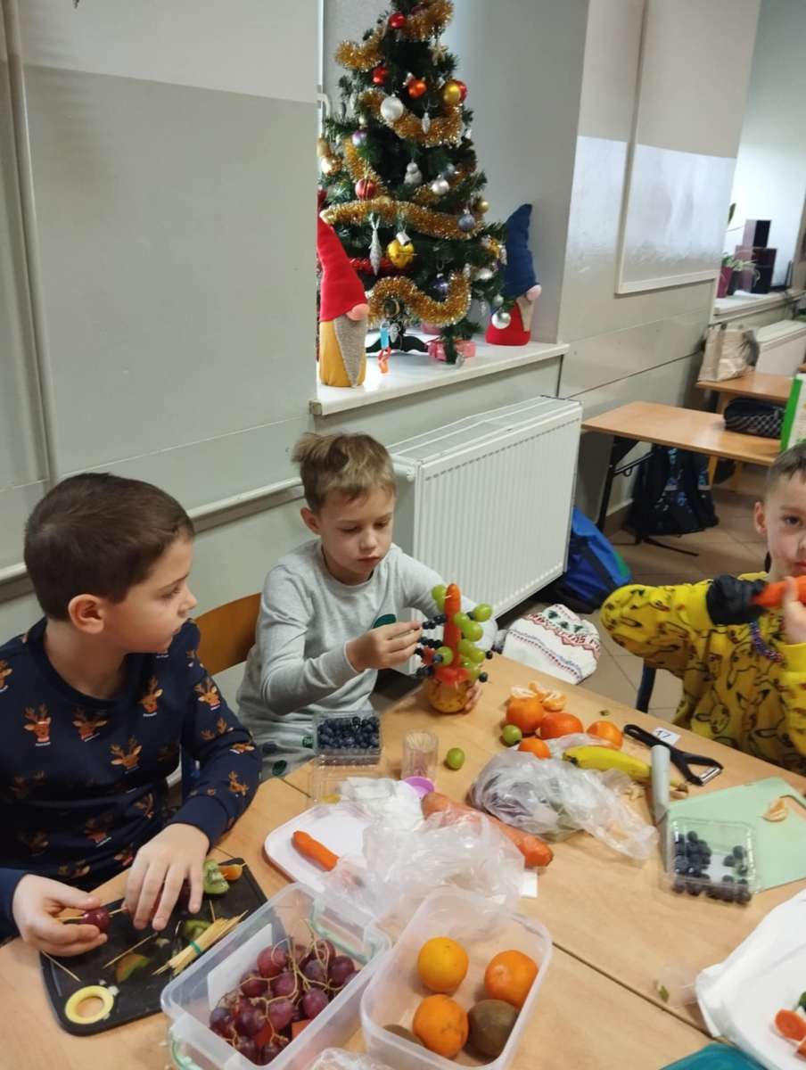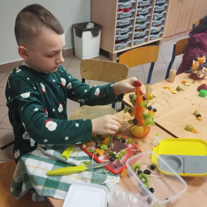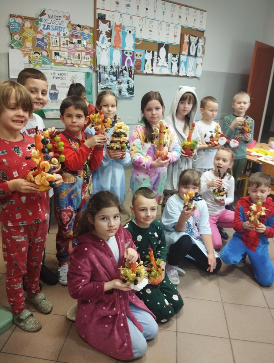 Podczas zajęć technicznych uczniowie klasy 1a Szkoły Podstawowej nr 1 im. gen. bryg. S. Gano w Opatowie wykonywały świąteczne choinki z owoców. Dzieci, pracując indywidualnie oraz w małych grupach, komponowały ozdoby z wykorzystaniem m. in. jabłek, mandarynek, winogron i innych owoców, dbając o estetykę oraz bezpieczeństwo pracy. Celem zajęć było nie tylko rozwijanie sprawności manualnej, kreatywności oraz umiejętności współpracy, ale także promowanie zdrowego odżywiania i kształtowanie prawidłowych nawyków żywieniowych poprzez bezpośredni kontakt z owocami. Dzieci wykazały duże zaangażowanie i radość z tworzenia prac, a wykonane choinki prezentowały się bardzo pomysłowo.