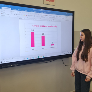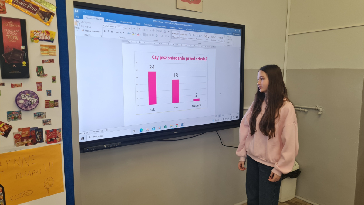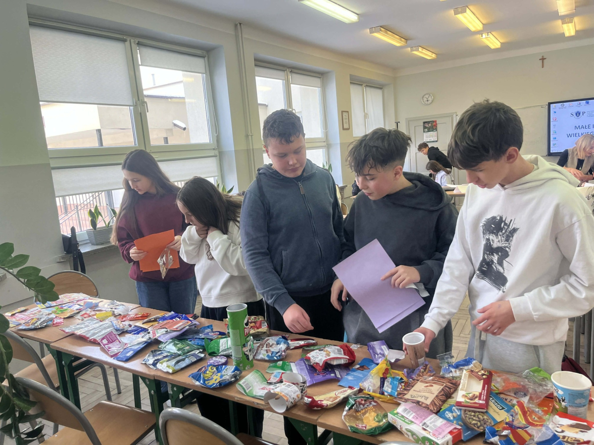 Kolejna część dnia to moduł „Co jem? — na tropie etykiet”, czyli matematyczne śledztwo dotyczące ukrytego cukru w przekąskach. Każda grupa wcieliła się w Jednostkę Śledczą, analizując produkty spożywcze takie jak napoje, jogurty, słodkie i słone przekąski. Porównywano zawartość cukru i kalorii, tworzono tabele, ankiety oraz wykresy. Uczniowie zaprezentowali swoje „podejrzane produkty” i sformułowali wnioski o świadomym odżywianiu.