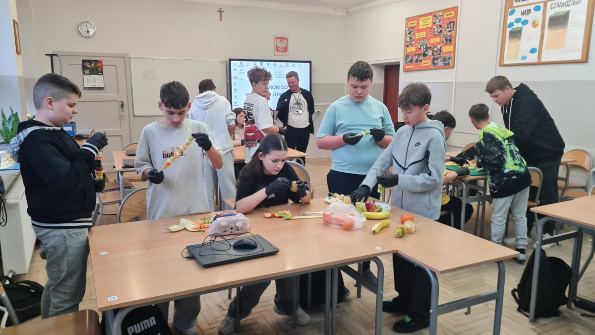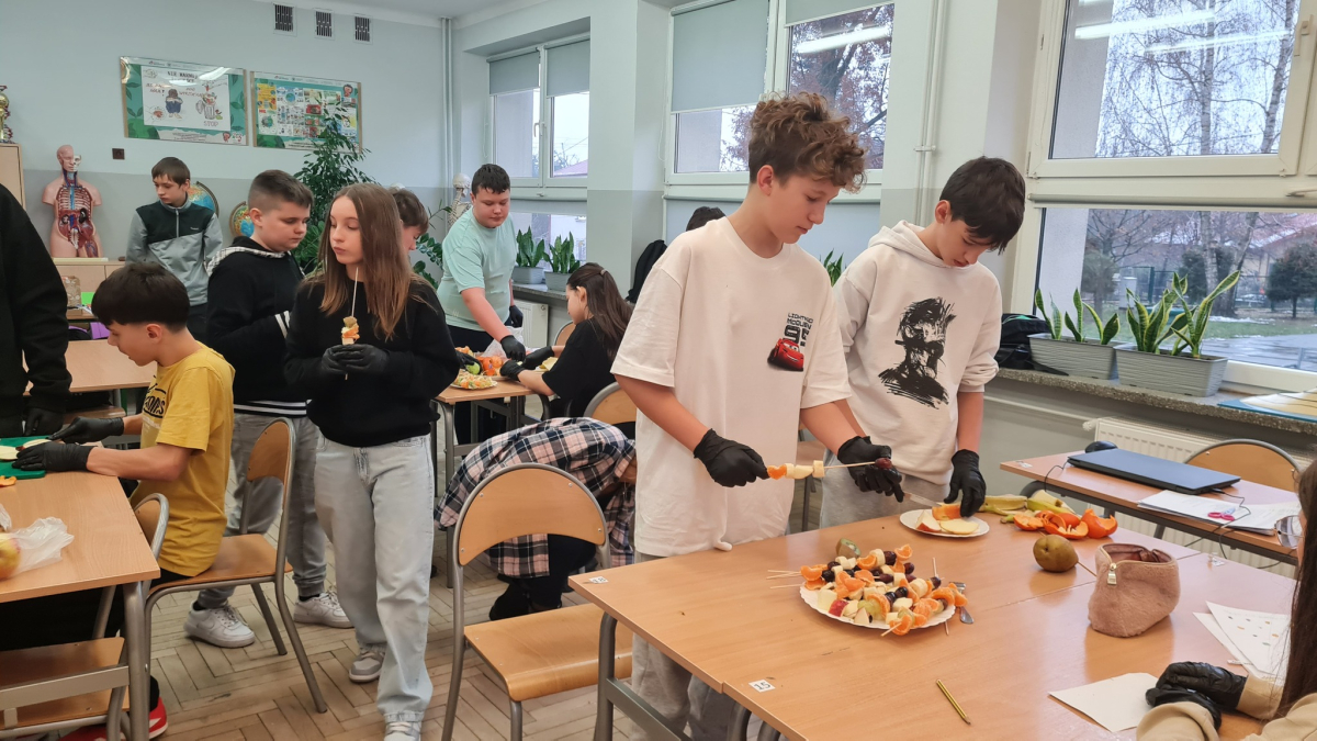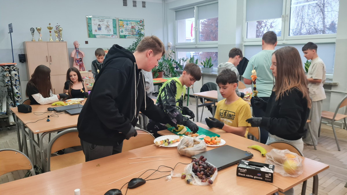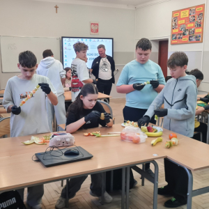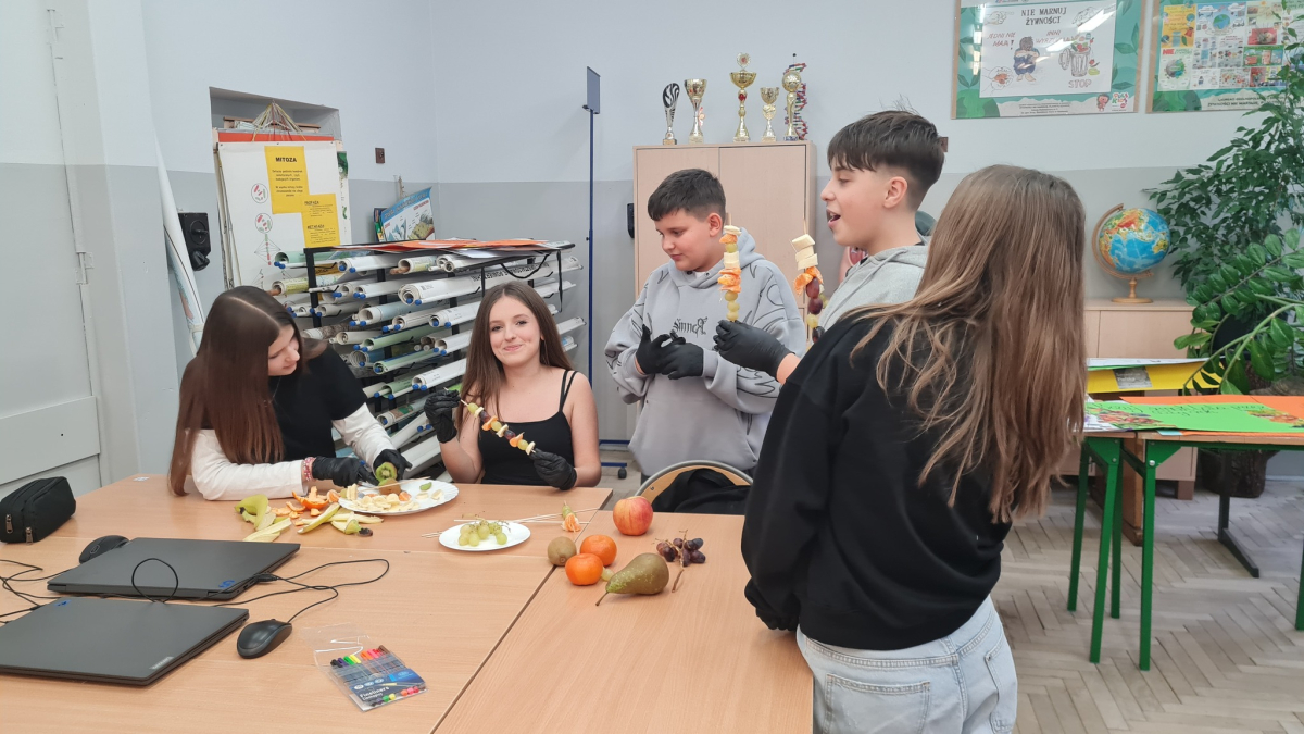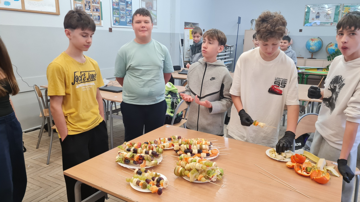 Uczniowie przygotowali także zdrowe przekąski — owocowe szaszłyki, samodzielnie dobierając składniki. Zajęcia rozwijały kreatywność, promowały zdrowe nawyki i zachęcały do jedzenia owoców.