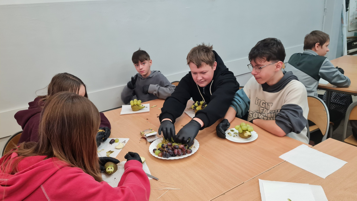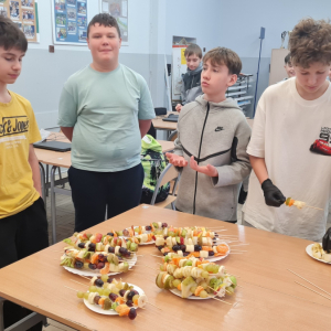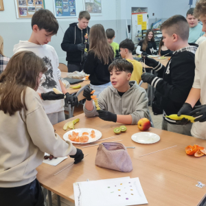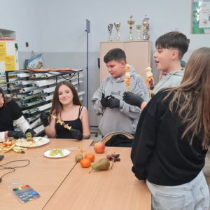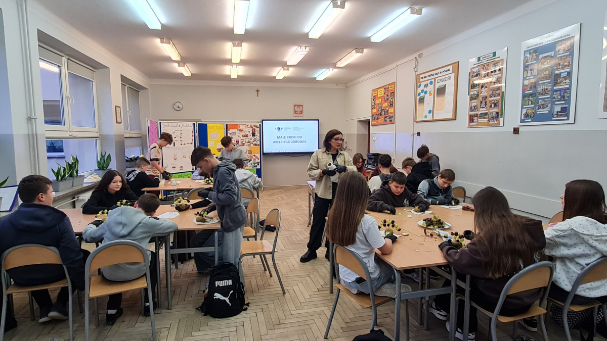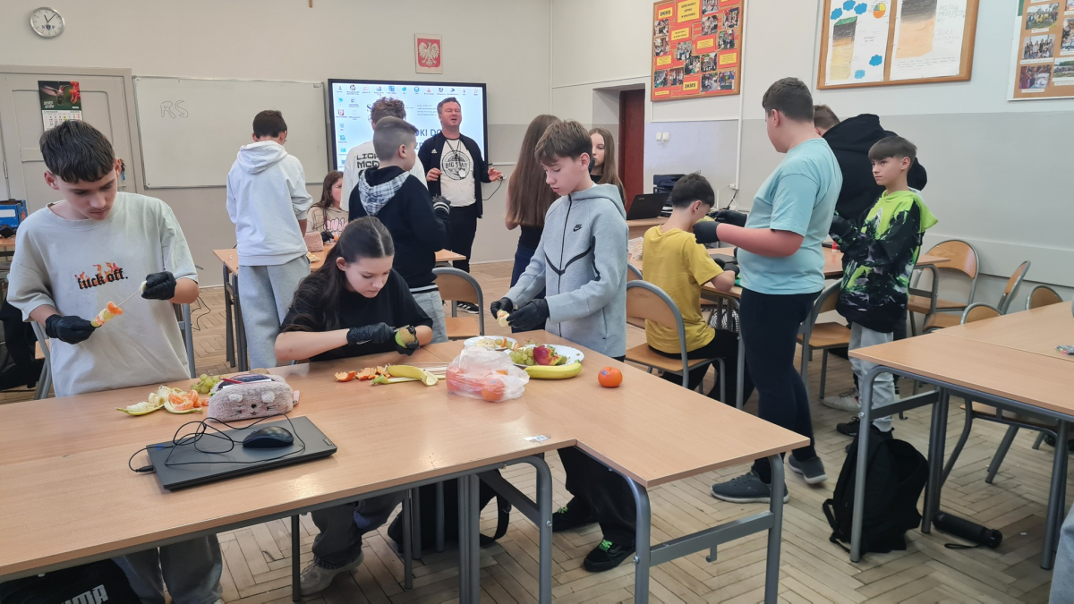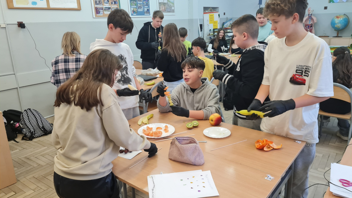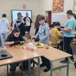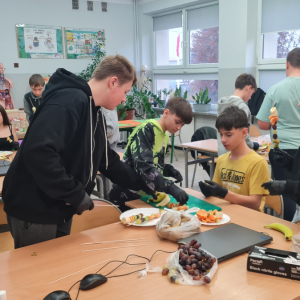Uczniowie przygotowali także zdrowe przekąski — owocowe szaszłyki, samodzielnie dobierając składniki. Zajęcia rozwijały kreatywność, promowały zdrowe nawyki i zachęcały do jedzenia owoców.