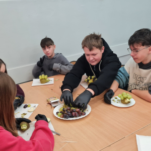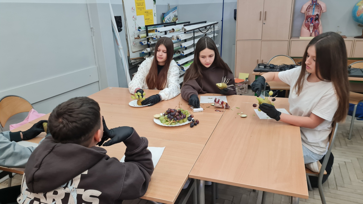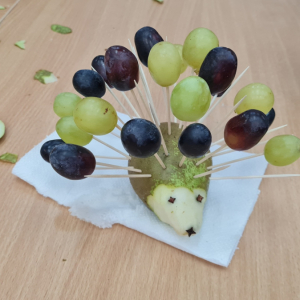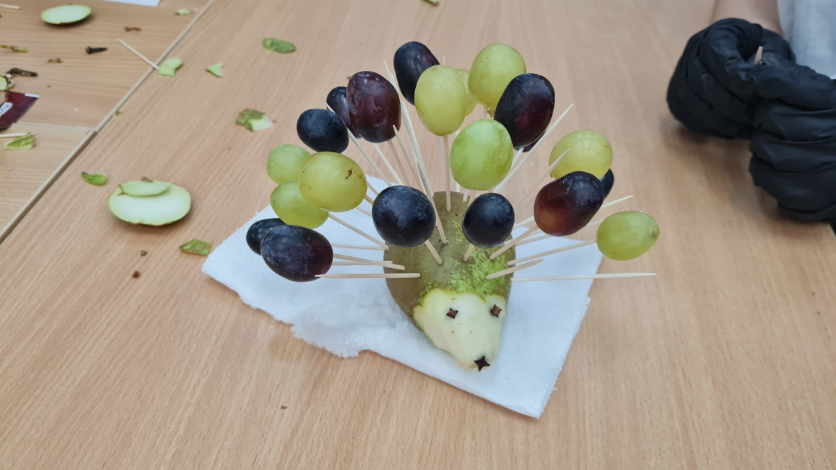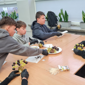 Czwartkowe zajęcia poświęcono zasadom zdrowego żywienia. Uczniowie przygotowali przekąski z winogron i gruszek w formie „owocowych jeżyków”.