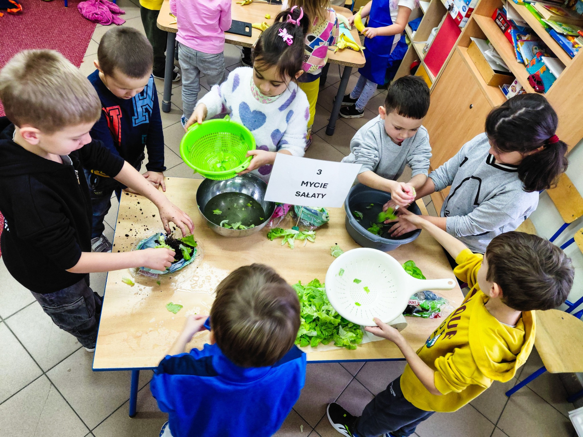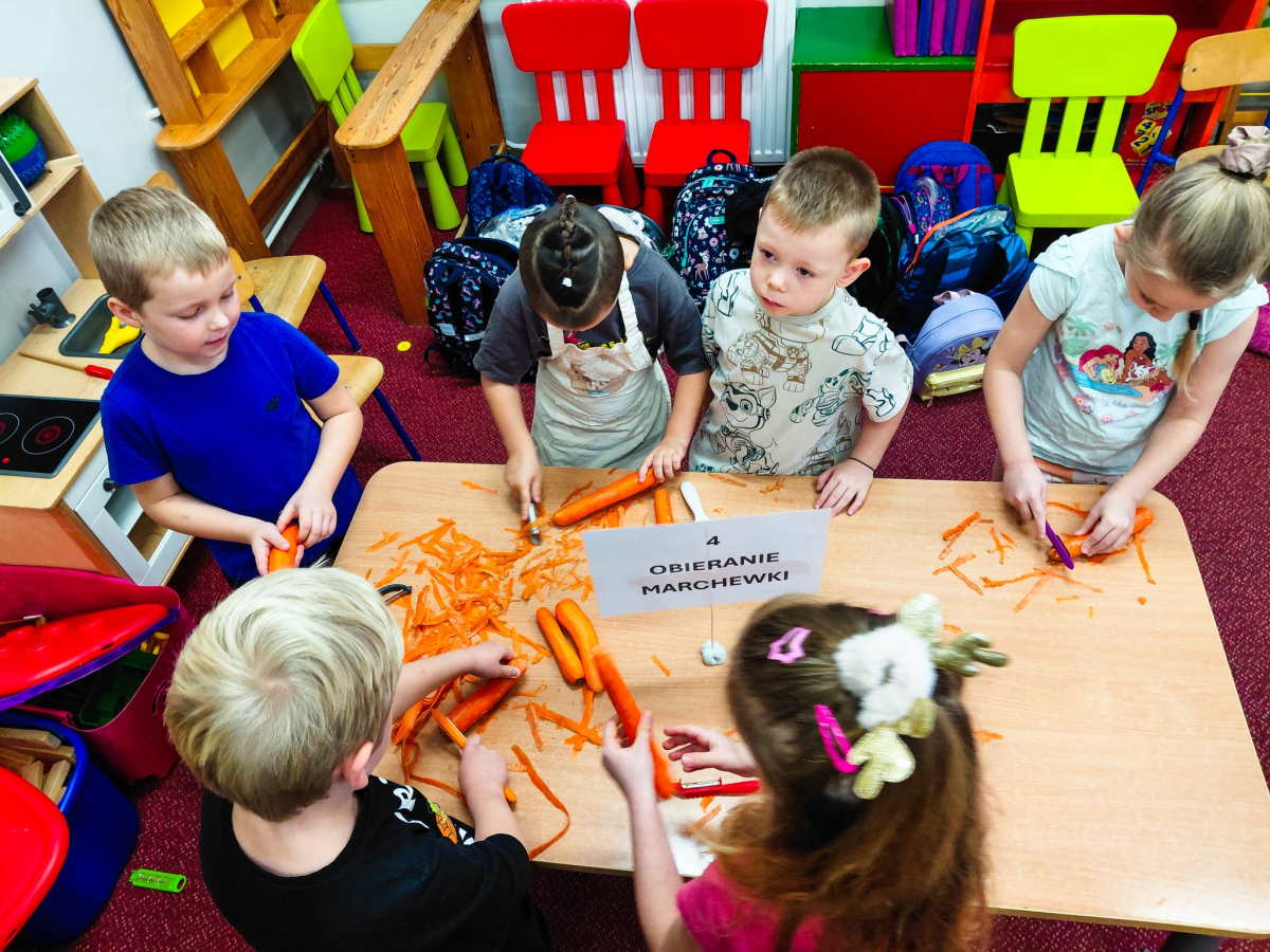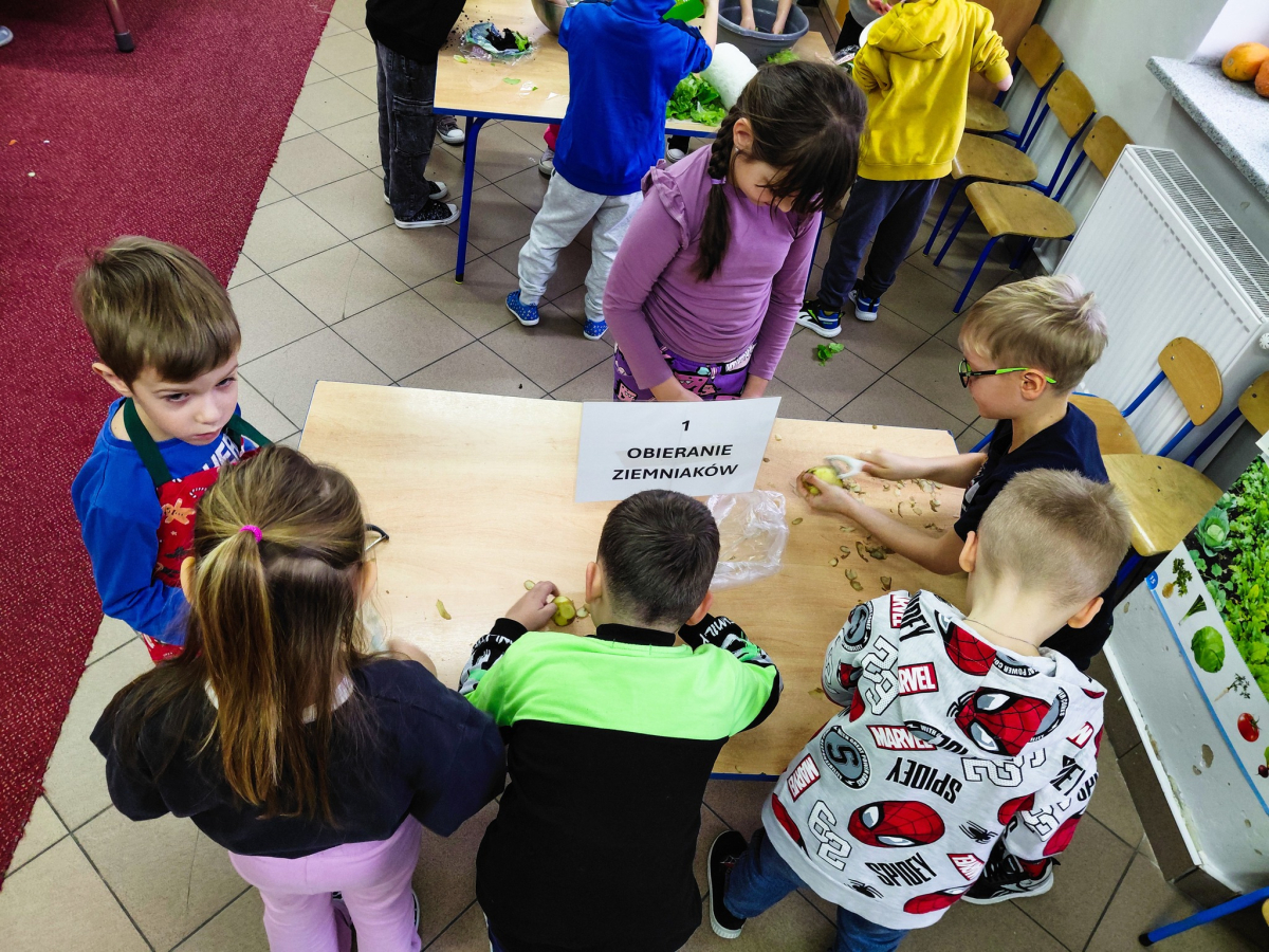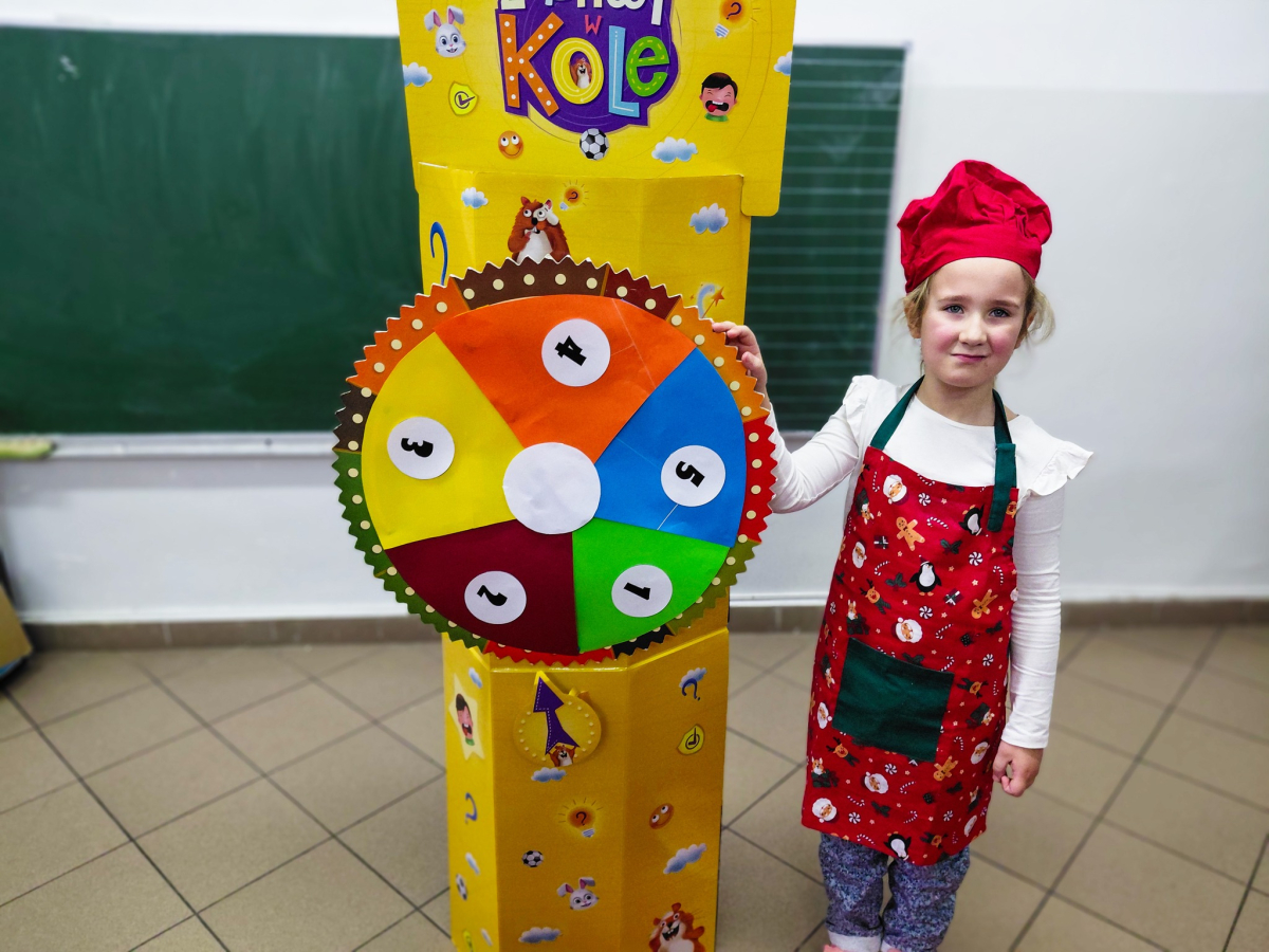 Dzień drugi – Koło Fortuny Zdrowych Zadań. Drugiego dnia uczniowie wzięli udział w zabawie „Koło Fortuny”, na którym czekało pięć kulinarnych konkurencji. Wylosowane zadania sprawdzały ich spryt i umiejętności: obieranie ziemniaków, skrobanie marchewki, tarcie jabłka, mycie sałaty oraz krojenie banana. To pełne emocji i śmiechu wyzwania, które jednocześnie uczyły samodzielności, współpracy i dbałości o zdrowe odżywianie.