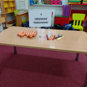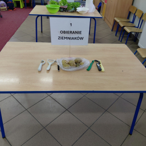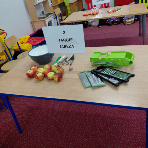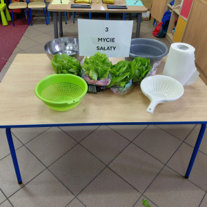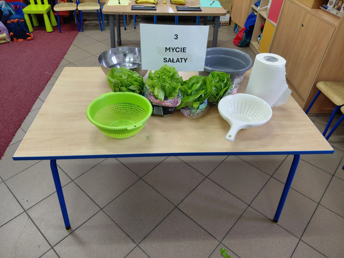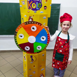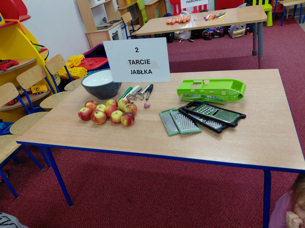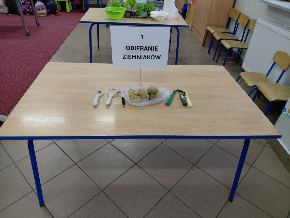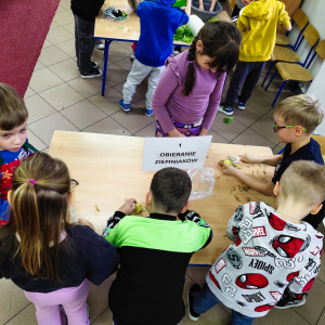 Dzień drugi – Koło Fortuny Zdrowych Zadań. Drugiego dnia uczniowie wzięli udział w zabawie „Koło Fortuny”, na którym czekało pięć kulinarnych konkurencji. Wylosowane zadania sprawdzały ich spryt i umiejętności: obieranie ziemniaków, skrobanie marchewki, tarcie jabłka, mycie sałaty oraz krojenie banana. To pełne emocji i śmiechu wyzwania, które jednocześnie uczyły samodzielności, współpracy i dbałości o zdrowe odżywianie.