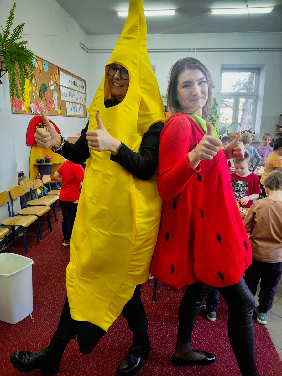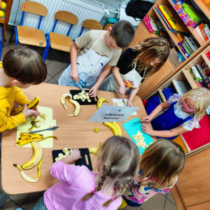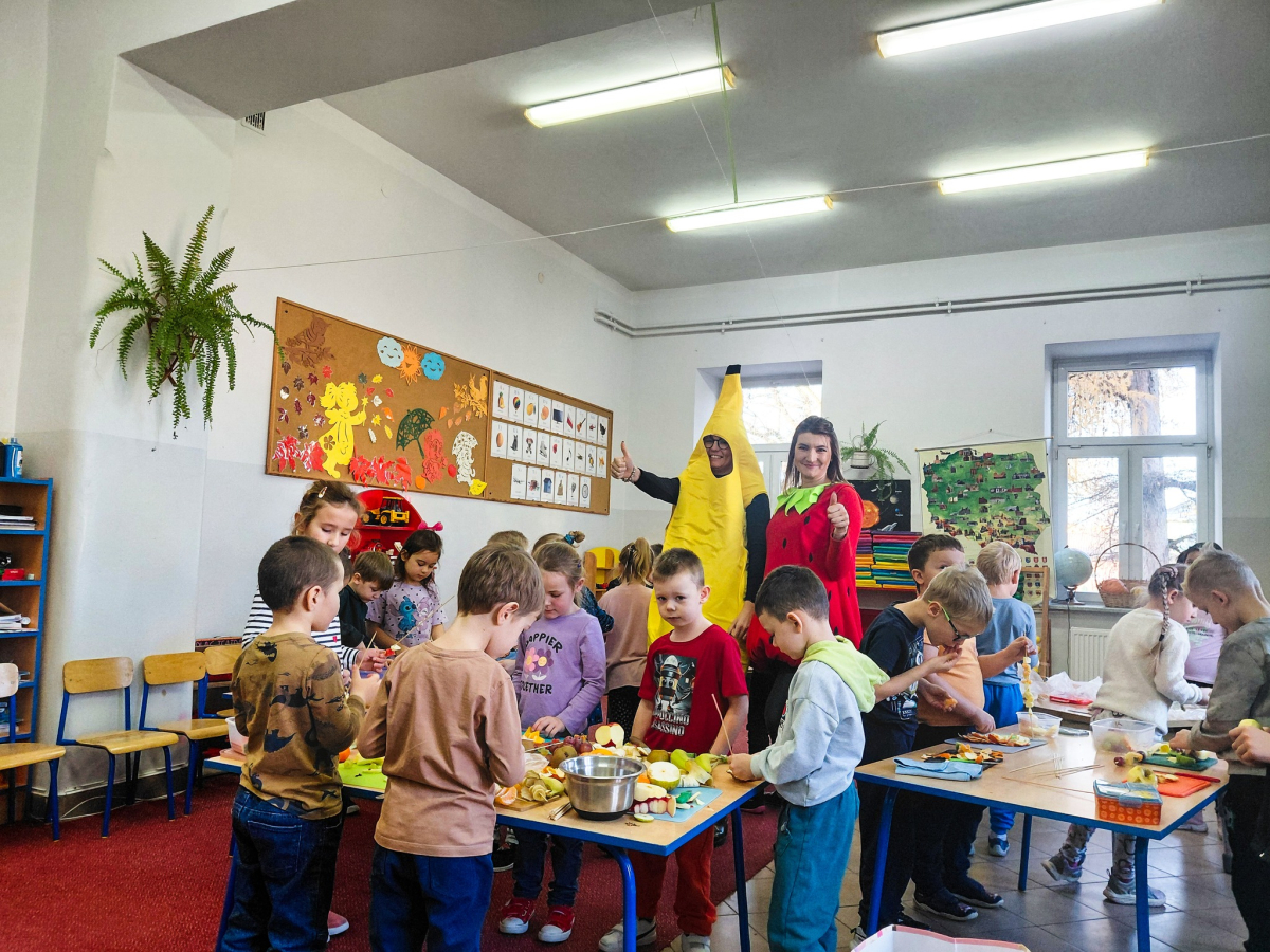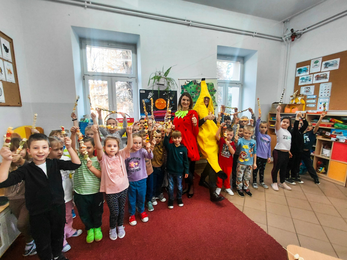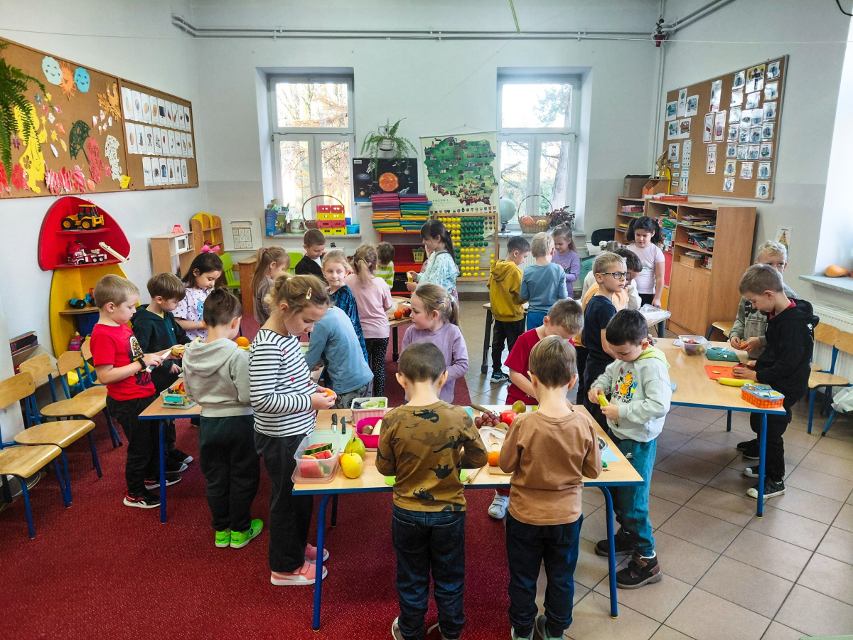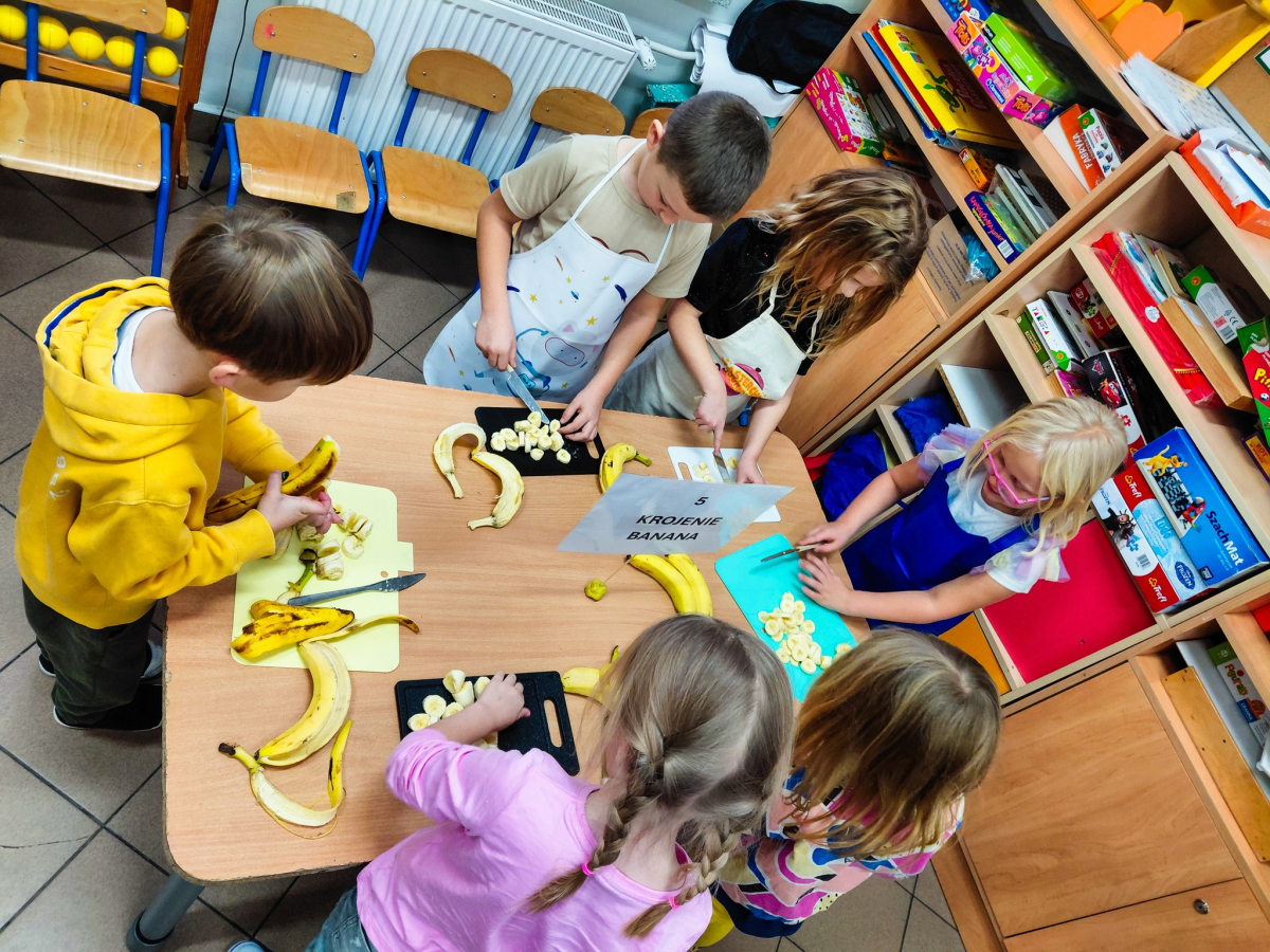 Dzień czwarty – Szaszłyki owocowe. Czwartego dnia uczniowie przygotowywali kolorowe, zdrowe szaszłyki owocowe. Kroili i obierali owoce, poznając ich zapachy, smaki i różnorodność. Podczas wspólnej zabawy śpiewali piosenki o owocach oraz rozmawiali o tym, które owoce lubią najbardziej i czy są one słodkie, czy kwaśne. Było to smaczne i radosne zakończenie tygodnia poświęconego zdrowemu odżywianiu.