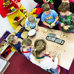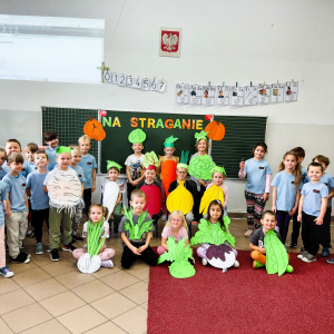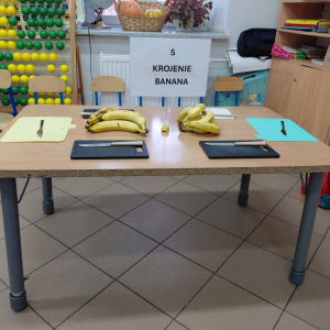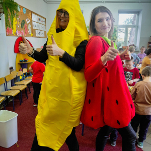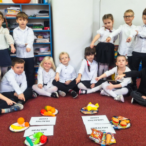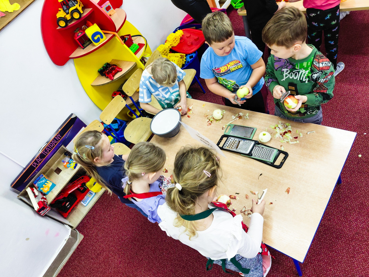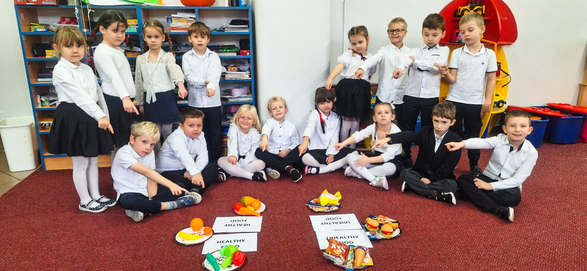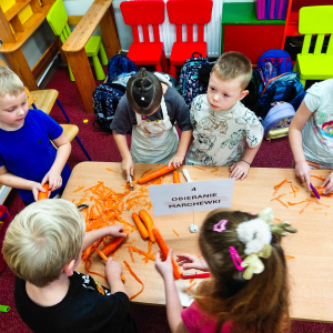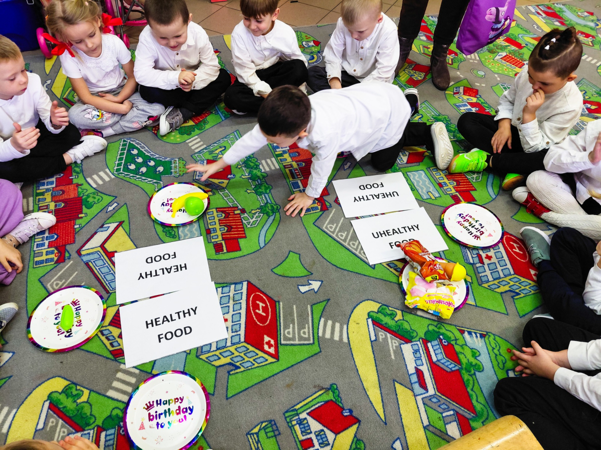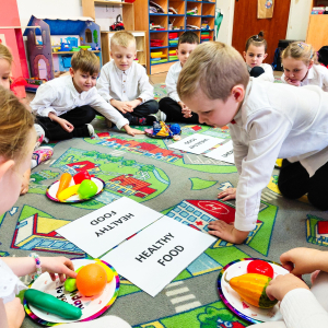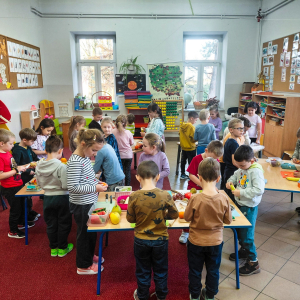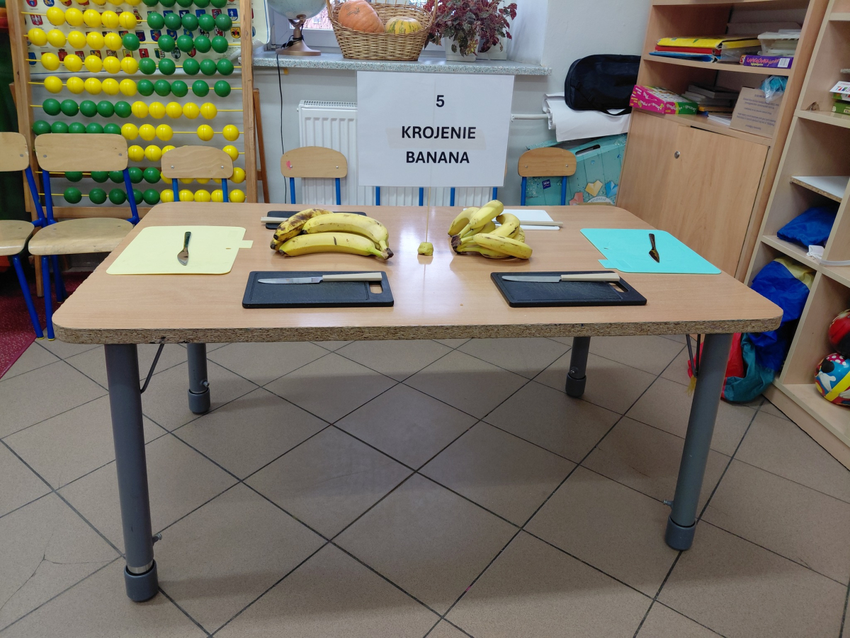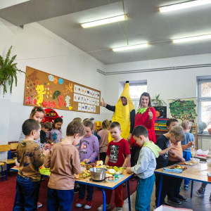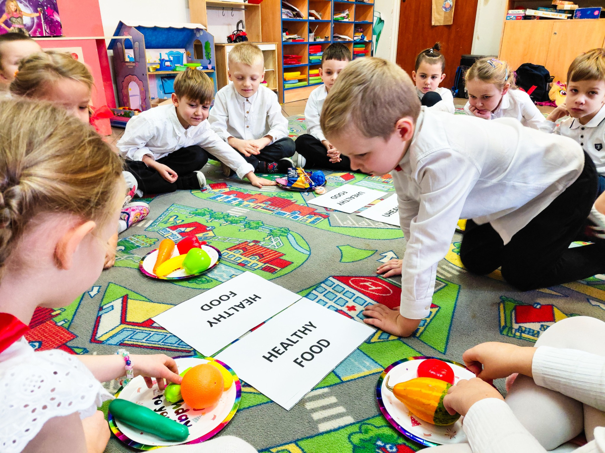 Dzień czwarty – Szaszłyki owocowe. Czwartego dnia uczniowie przygotowywali kolorowe, zdrowe szaszłyki owocowe. Kroili i obierali owoce, poznając ich zapachy, smaki i różnorodność. Podczas wspólnej zabawy śpiewali piosenki o owocach oraz rozmawiali o tym, które owoce lubią najbardziej i czy są one słodkie, czy kwaśne. Było to smaczne i radosne zakończenie tygodnia poświęconego zdrowemu odżywianiu.
