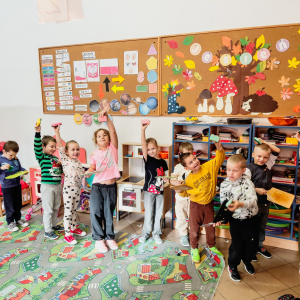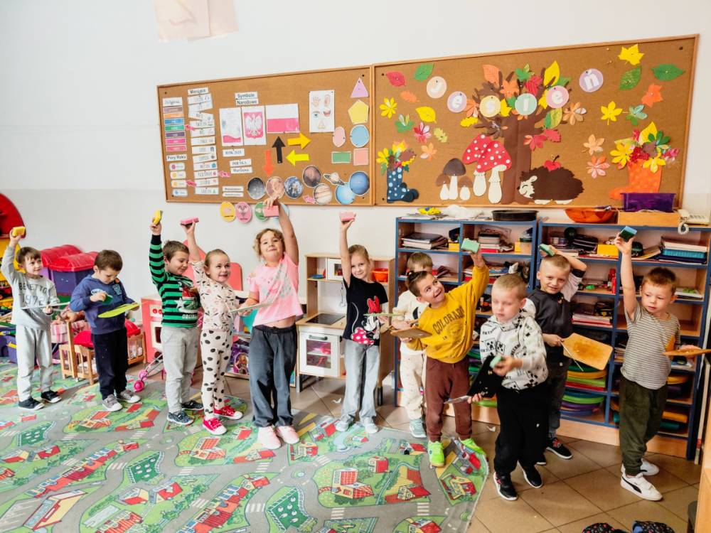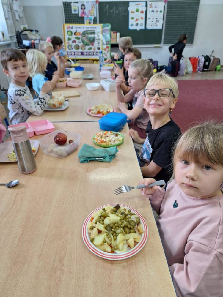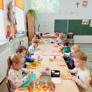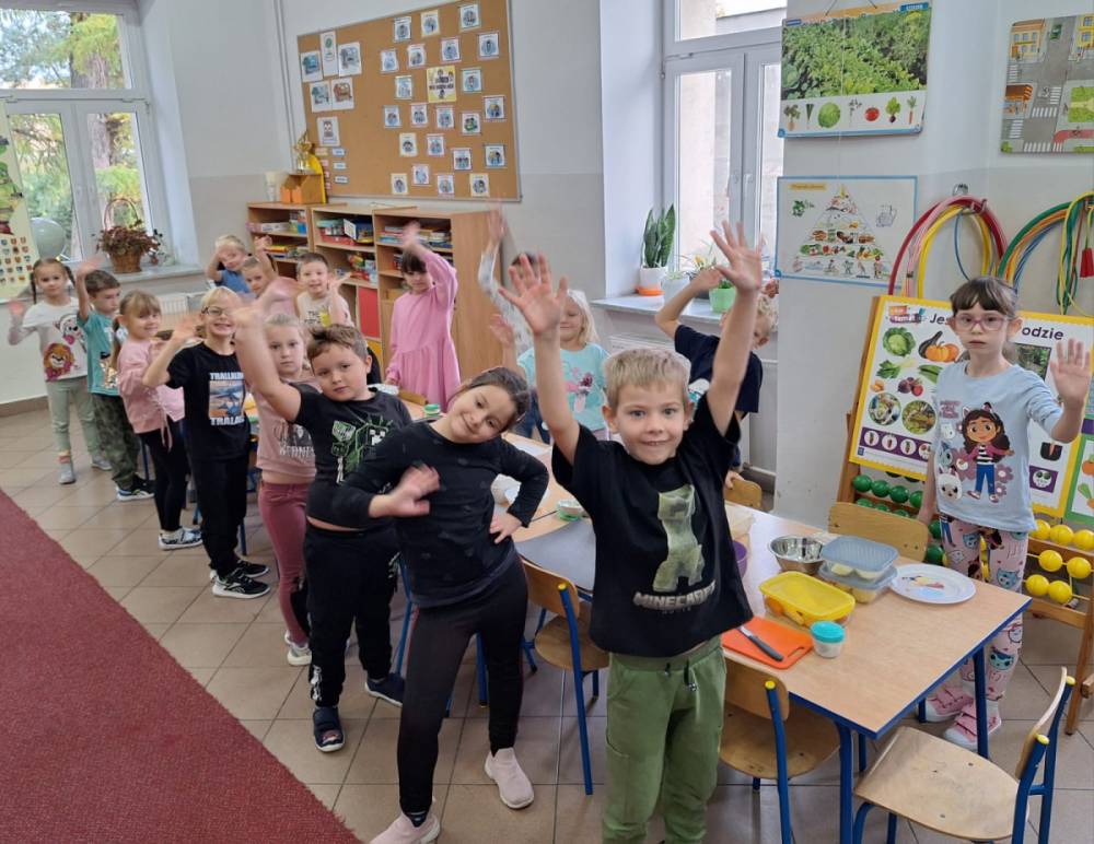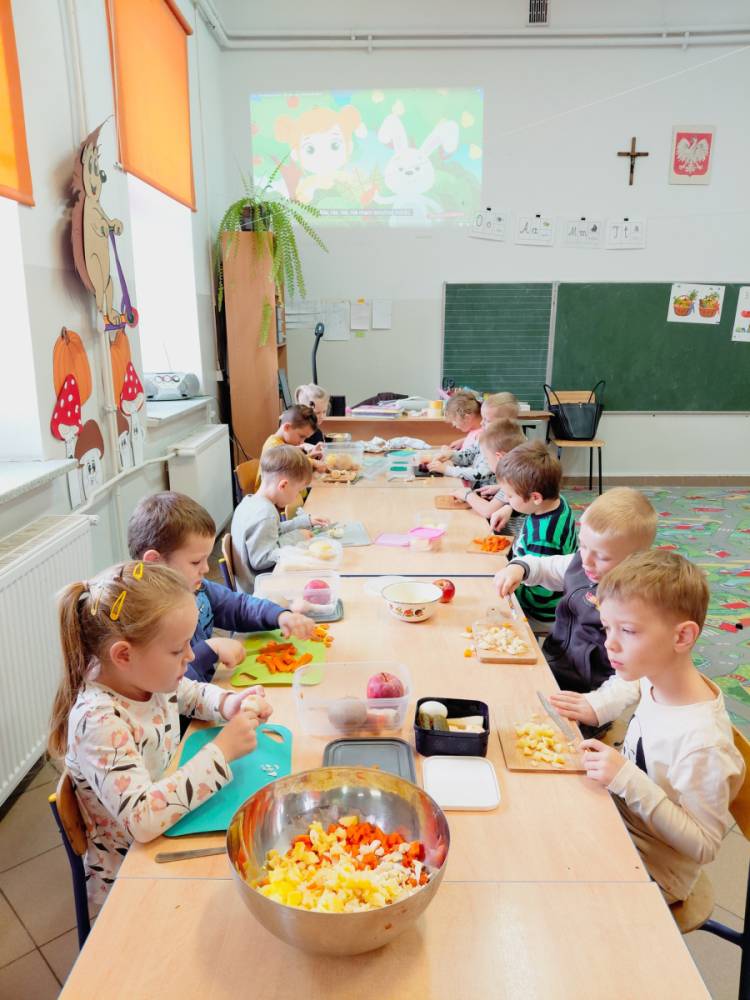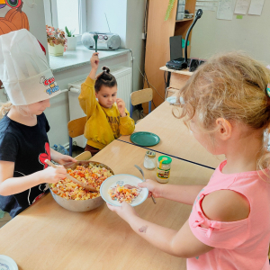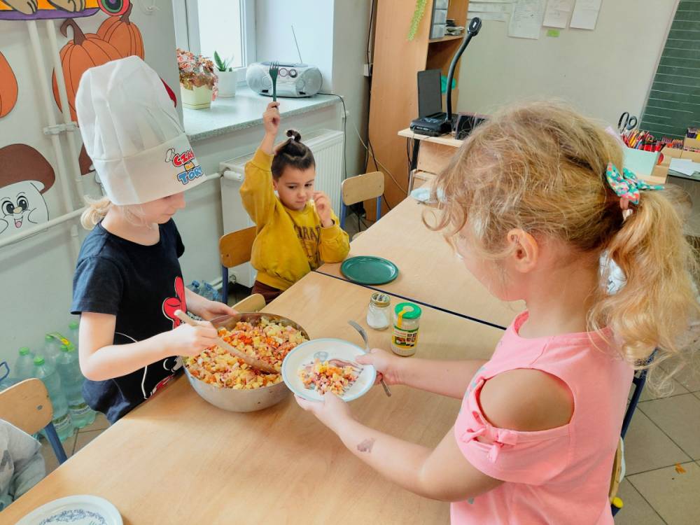 Zanim jednak zabraliśmy się do pracy, przypomnieliśmy sobie, jak wygląda piramida zdrowia i porozmawialiśmy o zawodach rolnika i kucharza. Dzieci opowiadały o warzywach, które przyniosły z domu, a przy okazji poznały wiersz Jana Brzechwy „Na straganie”. Podczas zajęć panowała radosna i wesoła atmosfera. Przedszkolaki z zapałem kroiły warzywa, pomagały sobie nawzajem i dbały o porządek w miejscu pracy. W tle rozbrzmiewały piosenki o warzywach, które dodawały energii i uśmiechu. Kiedy sałatka była gotowa, wszyscy z dumą spróbowali swojego kulinarnego dzieła. Było smacznie, zdrowo i bardzo wesoło!