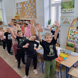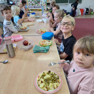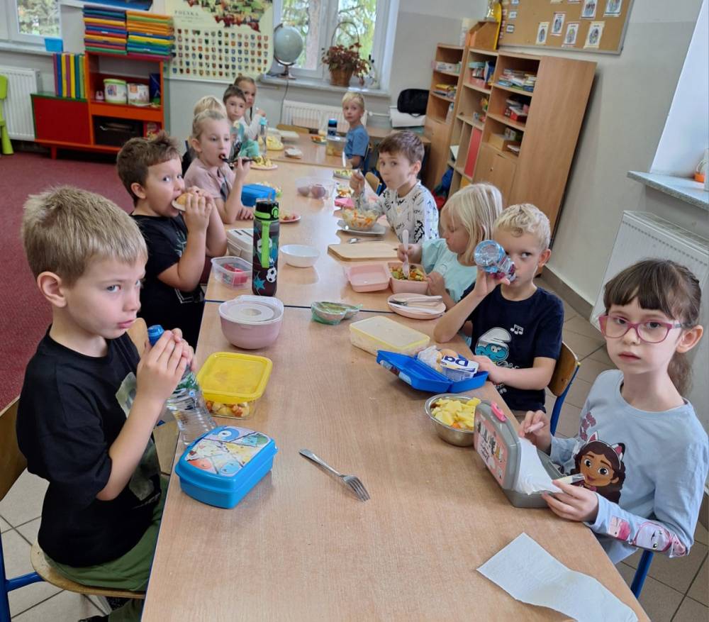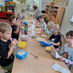 W ramach działania „Zdrowo się odżywiamy, dobrą formę mamy”, dzieci z oddziałów przedszkolnych A i B raz w miesiącu przygotowują wspólne, zdrowe śniadanie.